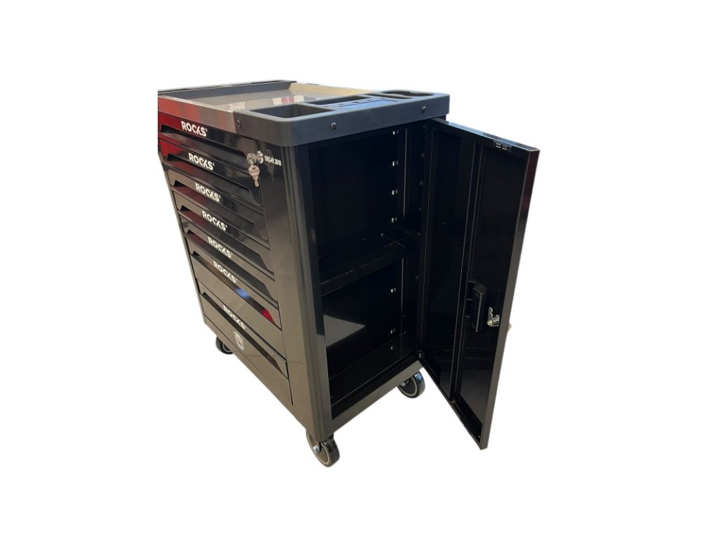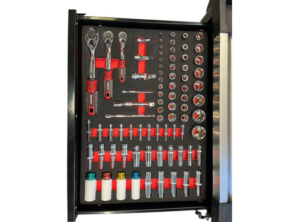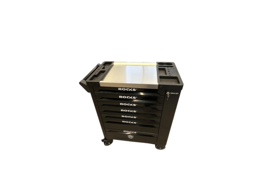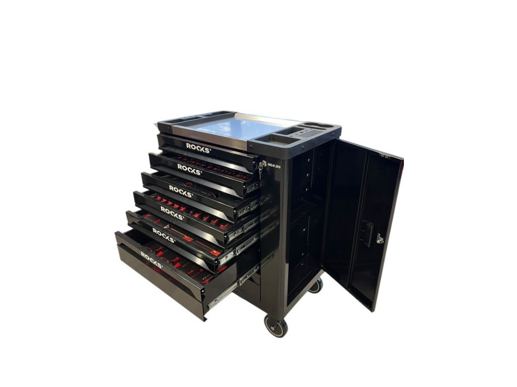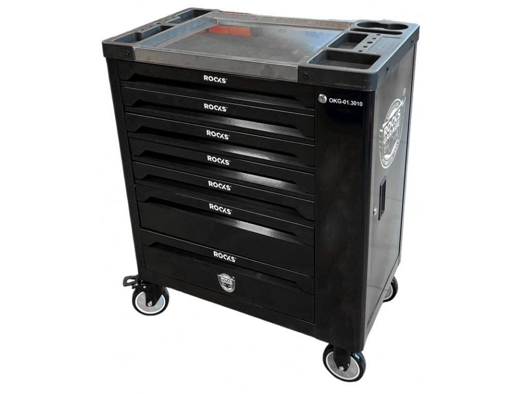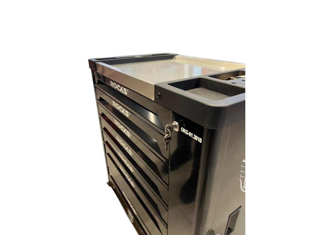 Maximální nosnost skříňky je 200 kg. Dvě otočná kolečka, obě s brzdami, jsou vybavena speciálními kuličkovými ložisky s aretačním mechanismem. Centrální zamykací systém účinně uzamyká všechny zásuvky. Tvarovaná pracovní deska je vybavena pracovní plochou potaženou plechem . Nářadí je uloženo v modulech vyrobených z odolné, pružné pěny. Pěnové moduly umožňují snadné čištění a snižují ztrátu nářadí. Další boční skříňka se dvěma policemi je ideální pro uložení dílenských chemikálií. Ocel použitá k výrobě skříňky ROOKS GARAGE a jejího nářadí je vysoce kvalitní, odolná CrV ocel a uhlíková ocel , které jsou potaženy leštěnou chromovou vrstvou.