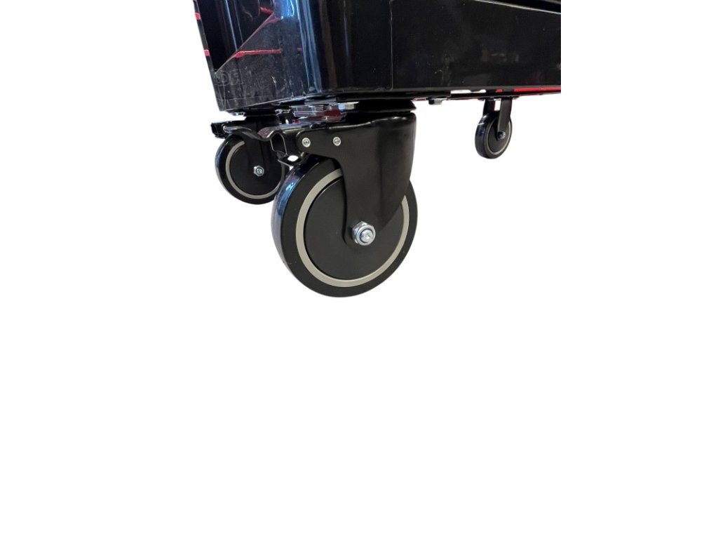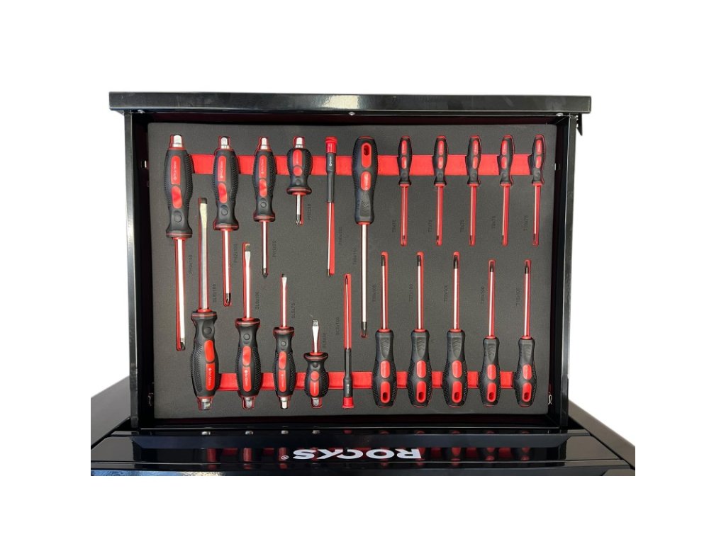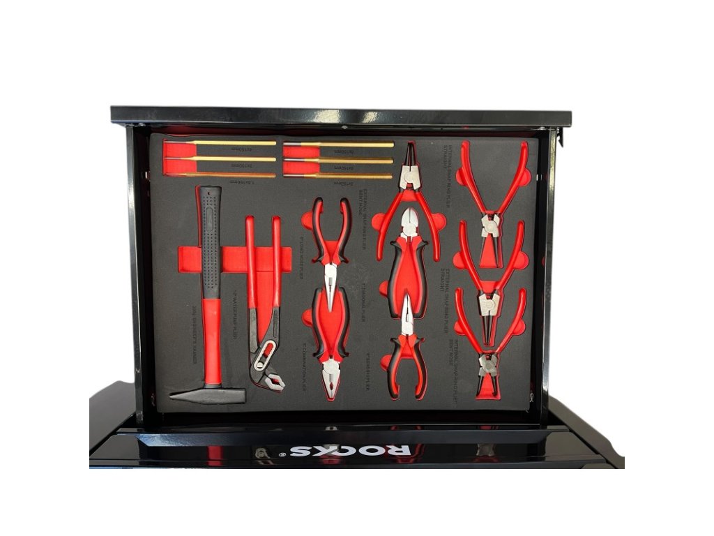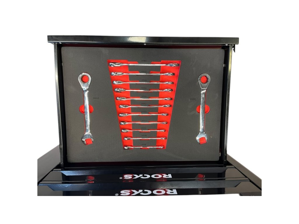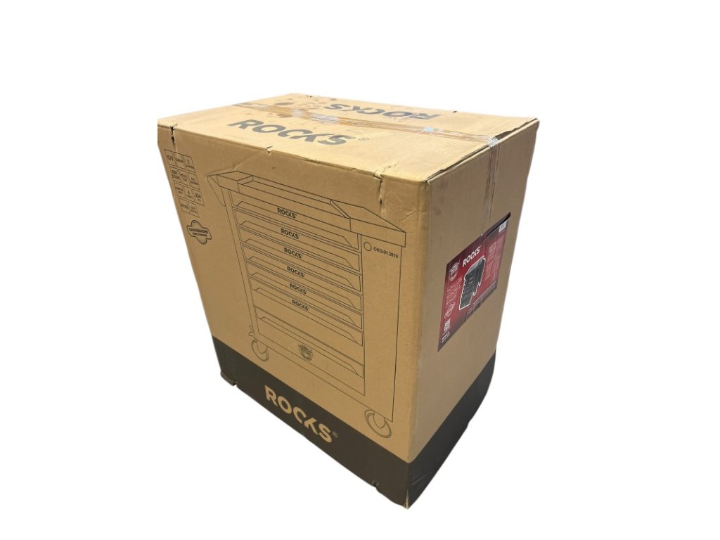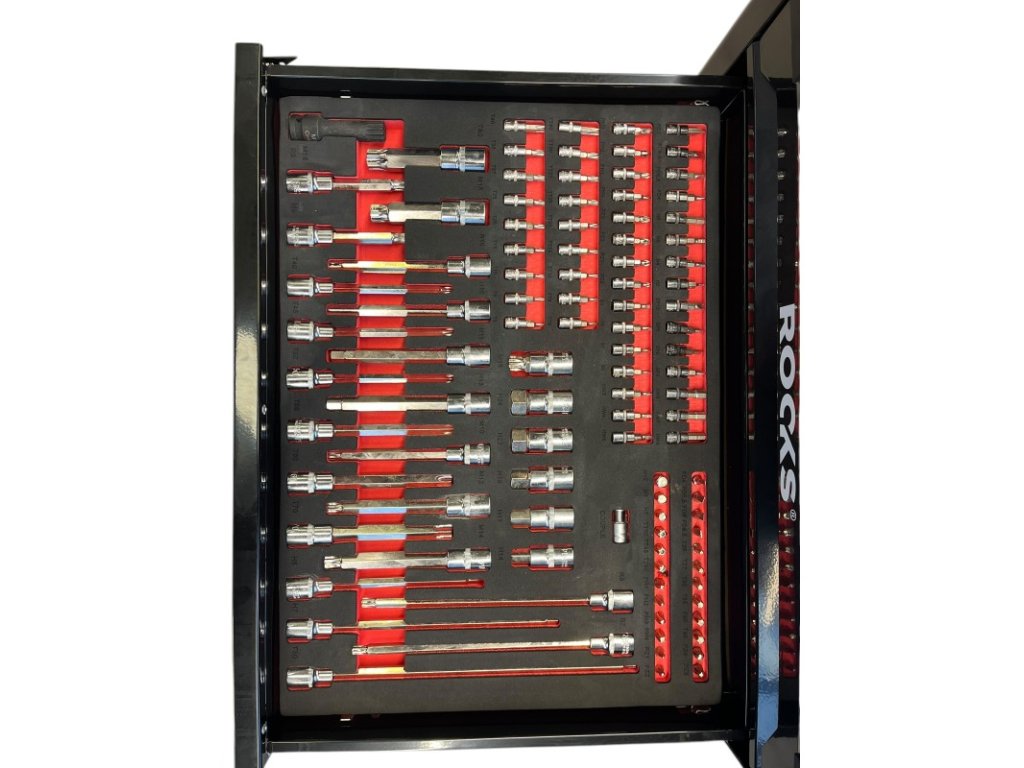 Maximální nosnost skříňky je 200 kg. Dvě otočná kolečka, obě s brzdami, jsou vybavena speciálními kuličkovými ložisky s aretačním mechanismem. Centrální zamykací systém účinně uzamyká všechny zásuvky. Tvarovaná pracovní deska je vybavena pracovní plochou potaženou plechem . Nářadí je uloženo v modulech vyrobených z odolné, pružné pěny. Pěnové moduly umožňují snadné čištění a snižují ztrátu nářadí. Další boční skříňka se dvěma policemi je ideální pro uložení dílenských chemikálií. Ocel použitá k výrobě skříňky ROOKS GARAGE a jejího nářadí je vysoce kvalitní, odolná CrV ocel a uhlíková ocel , které jsou potaženy leštěnou chromovou vrstvou.
