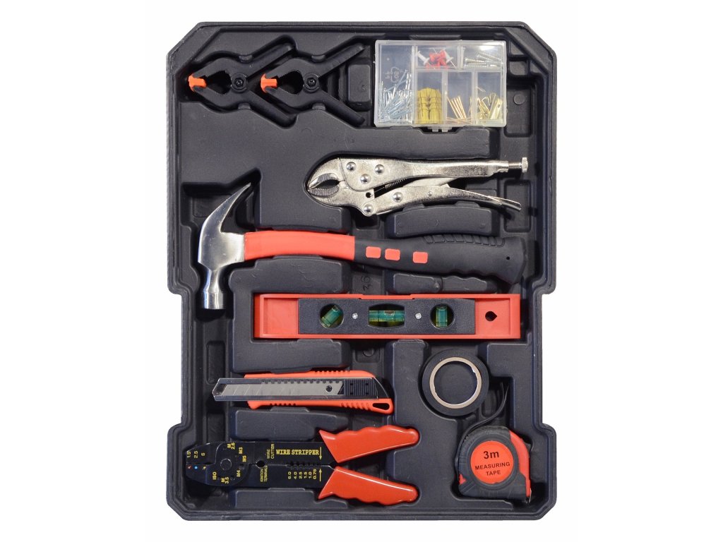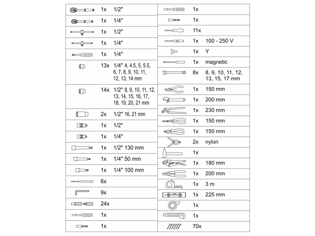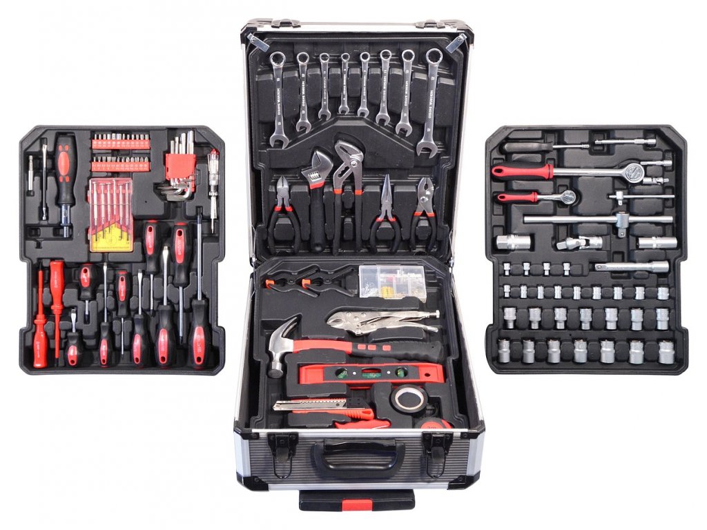 Sada obsahuje celou řadu kleští, šroubováků, gola klíčů, kladivo, vodováhu, stranové i imbus klíče, bity, základní spojovací materiál a celou řadu dalšího nářadí, které je vhodné pro použití jak doma, v garáži, tak i na cestách.