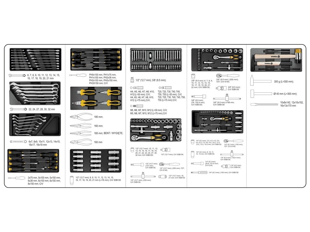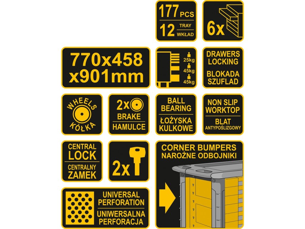 Nářadí v ceně: první 4 šuplíky obsahují 177 ks nářadí ve 12 plastových vložkách, pro snadnou organizaci.