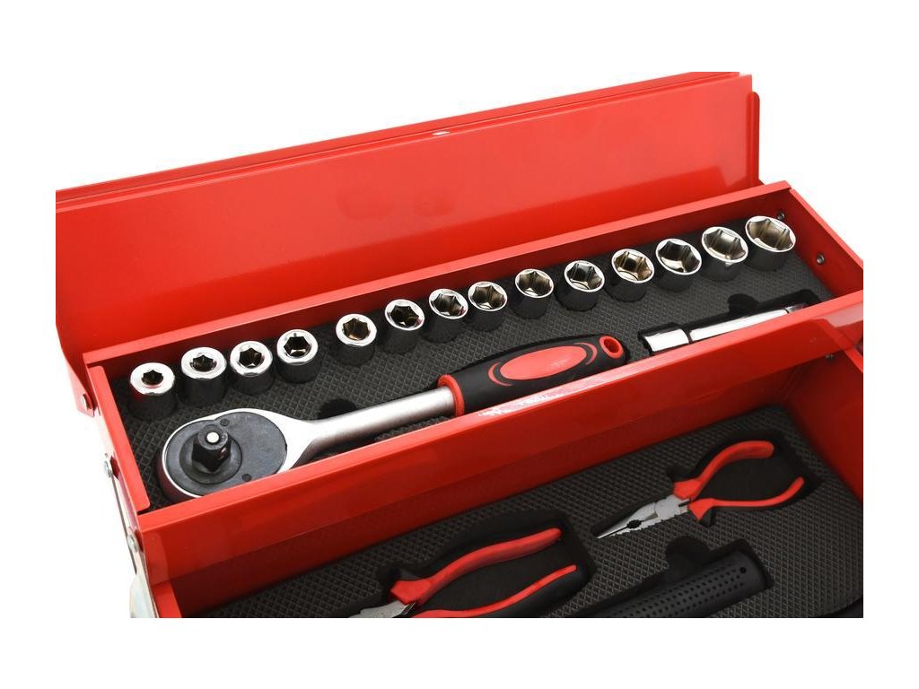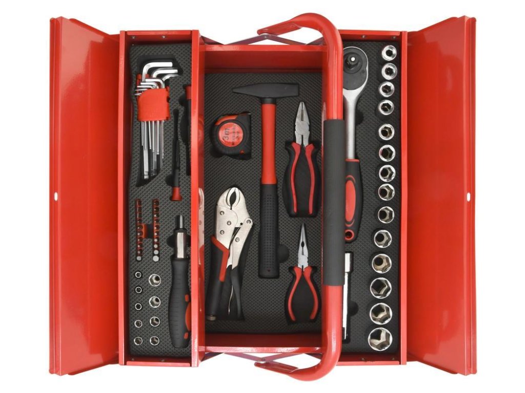 Sada obsahuje univerzální šroubovák včetně bitů, imbusové klíče s kulatým zakončením, kleště prodloužené, samosvorné i kombinované, gola sadu 1/2" včetně 14x nástavců, kladivo, svinovací metr (2 m) a další.