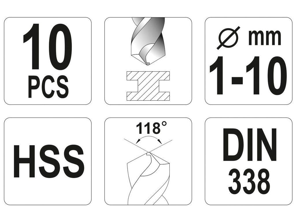 Sada 10 ks vrtáků z rychlořezné oceli se zesíleným břitem a špičkami s ůhlem 118°.