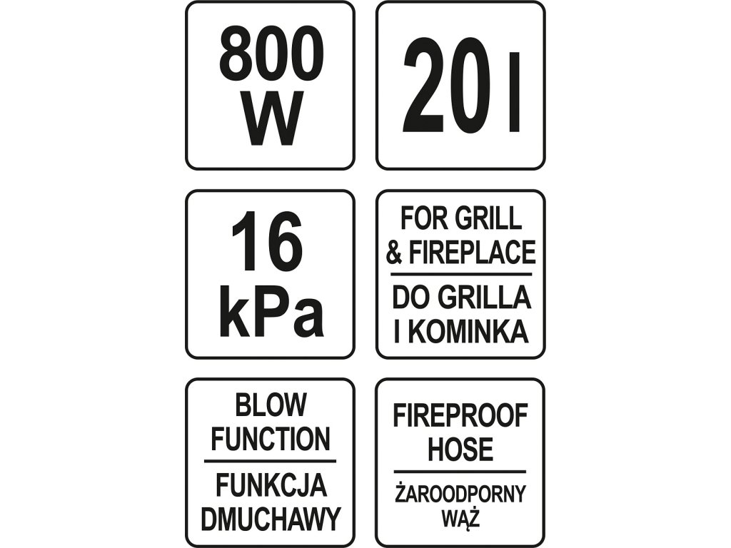 Sací hadice je tepelně odolná a je zakončena hliníkovou sací hubicí. Nádoba na popel je vyrobena z nerez oceli a její objem činí 20 litrů.