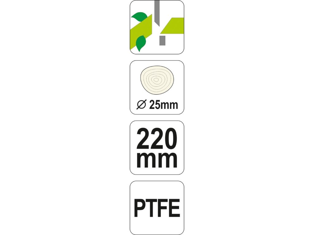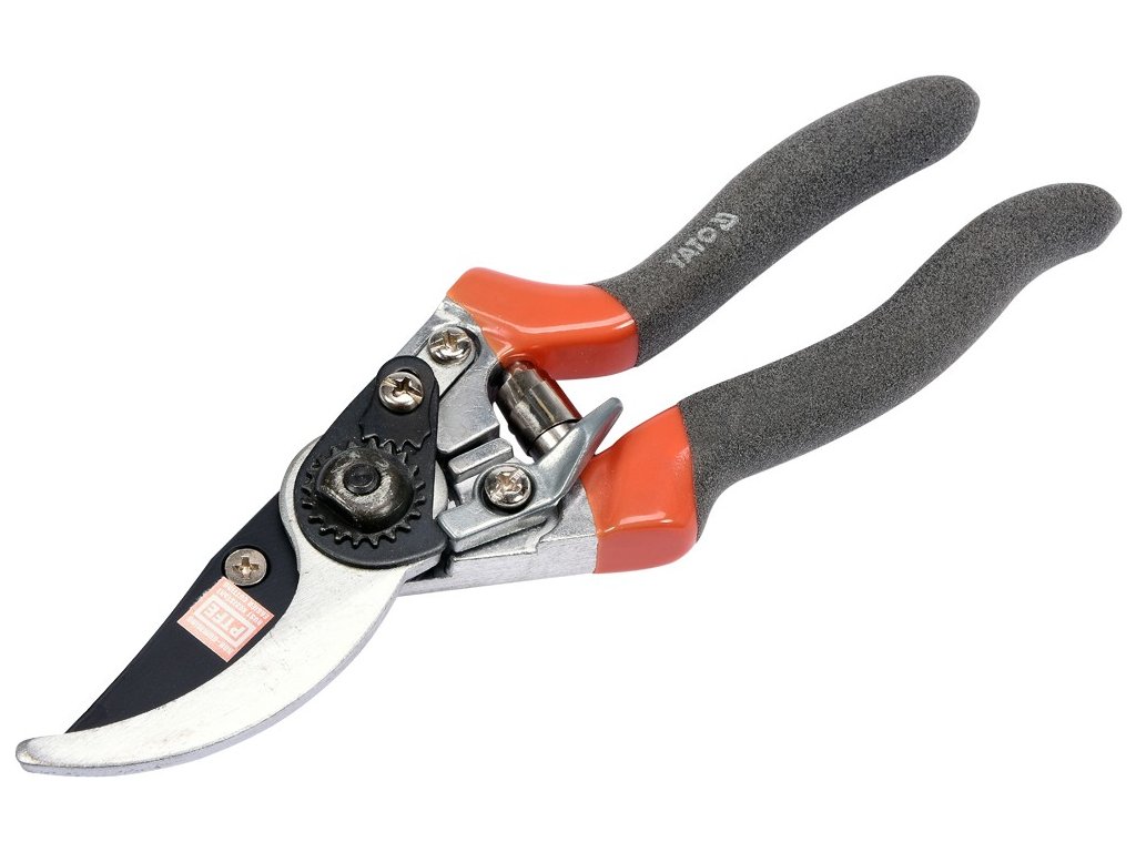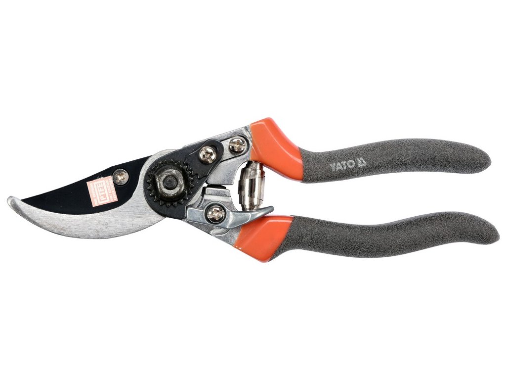 Ruční zahradní nůžky,čepel z karbonové ocely vrchní ostří potažené PTFE se šikmým střihem o celkové délce 220 mm průměru střihu do 25mm, určené ke střihu větví či jiného rostlinného materiálu s protiskluzovou rukojetí pro bezpečné držení.Značka YATO se je záruka vysoké kavilty.