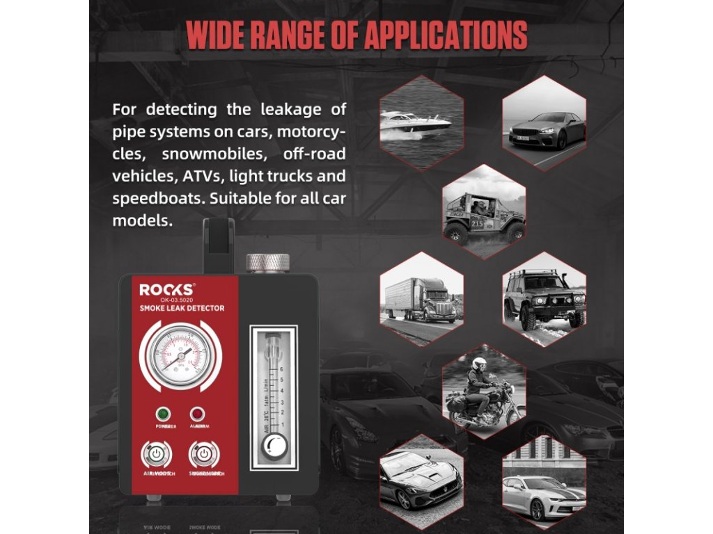 Přístroj ROOKS je účinný a přesný diagnostický nástroj, který pomáhá při opravách všech trubkových, kapacitních a uzavřených systémů pracujících pod tlakem nebo podtlakem. Je nezbytný pro diagnostiku osobních automobilů, dodávek a menších nákladních vozidel, stejně jako motorových člunů, zemědělských strojů, spalovacích generátorů, vodních nádrží, spalovacích motorů a dalších.